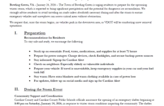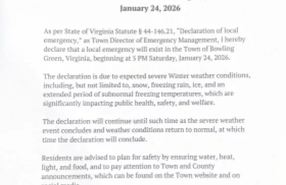 Town of Bowling Green Shares Emergency Preparedness Plan Ahead of Winter Storm Author: Administration Posted on: 01-24-2026